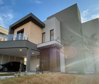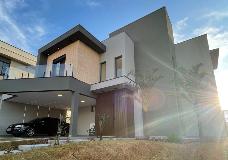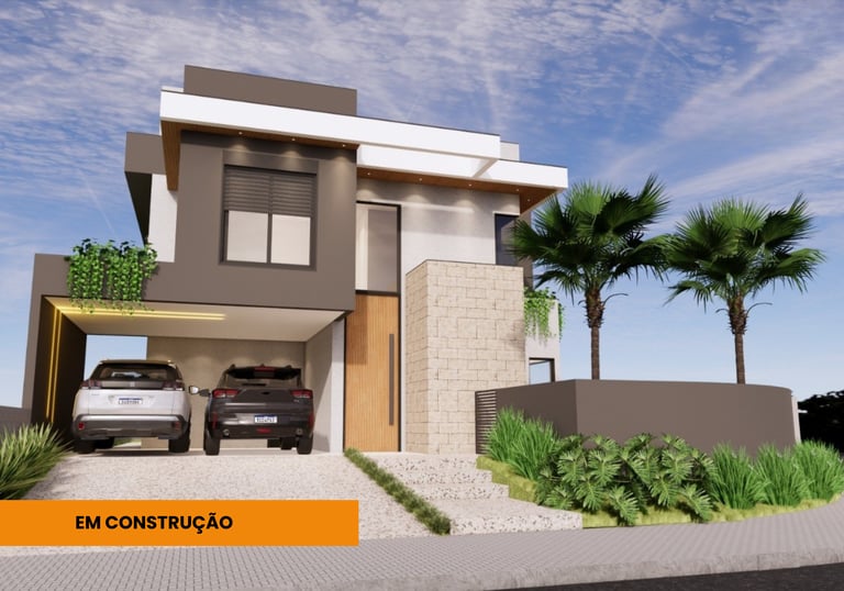 Projeto de linhas marcantes e volumetria moderna, pensado para valorizar a iluminação natural ao longo do dia. A combinação de texturas, os elementos amadeirados e a garagem para dois veículos reforçam o alto padrão da proposta.