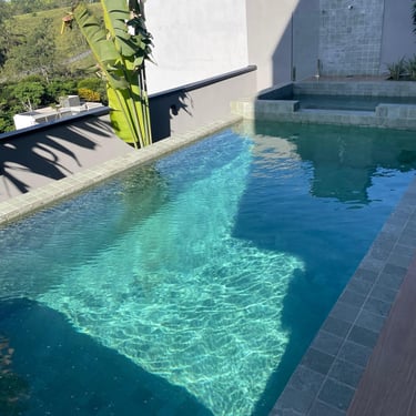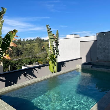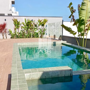 Para o lazer, a piscina privativa com iluminação em LED e hidromassagem proporciona momentos únicos de relaxamento.
