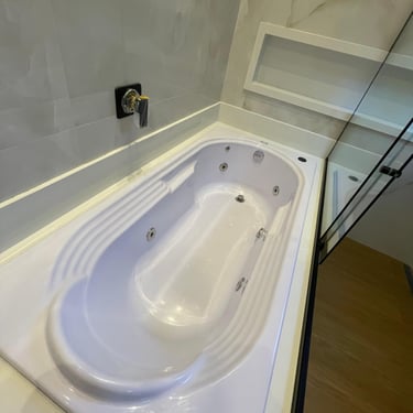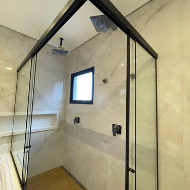 A suíte master é um verdadeiro refúgio, com banheiro duplo, equipado com ducha dupla, cuba dupla e banheira de hidromassagem, oferecendo uma experiência de spa dentro de casa.